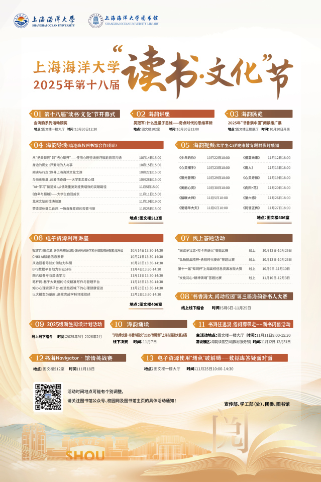 金秋送爽,书香沁心。在上海海洋大学迎来113周年校庆之际,第十八届“读书・文化”节也将如约启幕。113载栉风沐雨,学校始终以文化育人、以书香润心;“读书・文化”节自2001年举办,至今已成为师生共赴的文化之约、思想之宴。